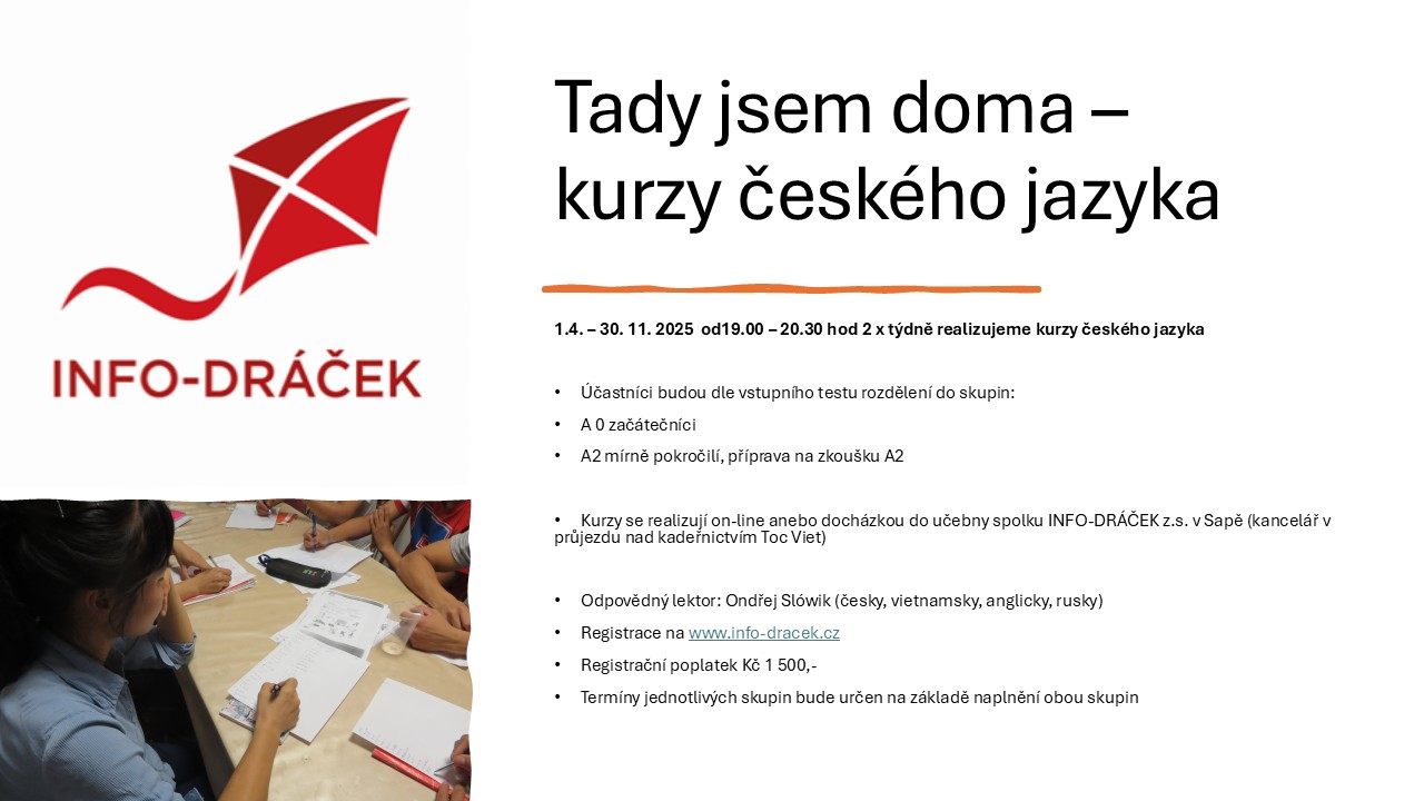Workshopy českého jazyka pro úplné začátečníky, mírně pokročilé se zaměřením na složení zkoušky A2 a dětskou skupinu. Workshopy českého jazyka má za cíl získání jazykových dovedností v běžném životě a informovanost v podnikatelském prostředí. Výuka je realizovaná v tematických blocích, jako je běžná komunikace, u lékaře, na úřadě a finanční gramotnost. Projekt se realizuje již devátým rokem a je finančně podpořen Ministerstvem vnitra ČR, Magistrátem hlavního města Praha a Městskou části Praha Libuš.
